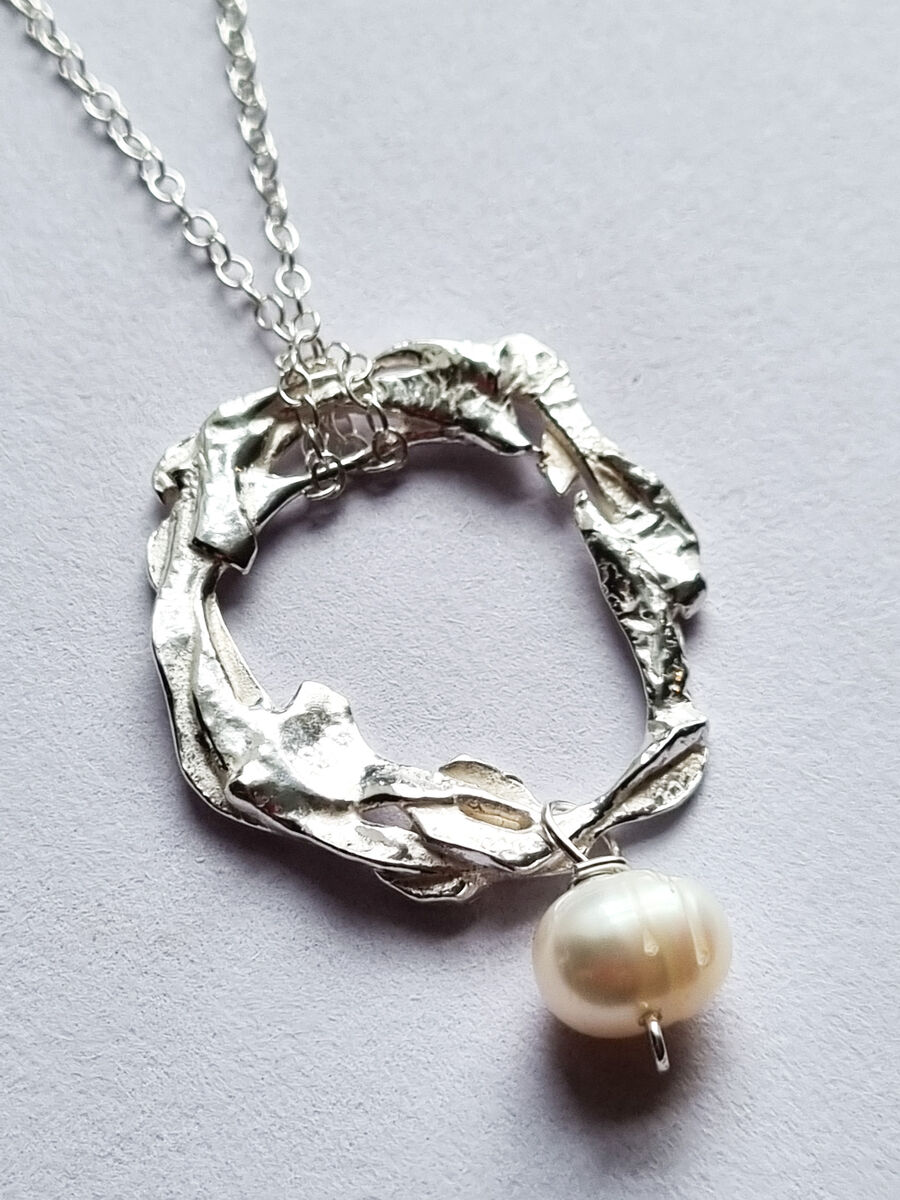 It's around 30mm x 20mm on a recycled silver trace chain with a handmade chunky hook clasp, and a 8mm freshwater pearl drop.